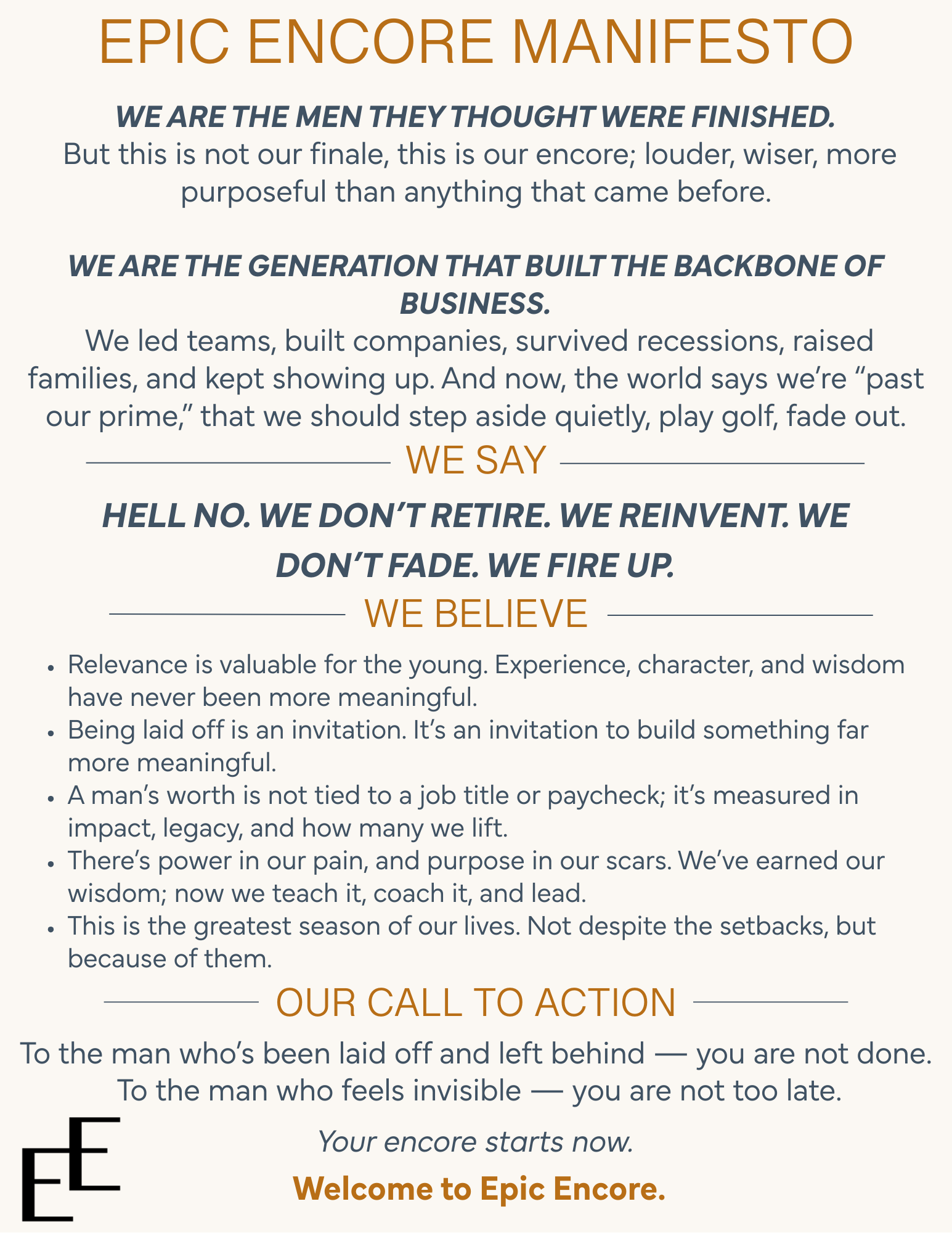 At Epic Encore, we help men over 50 design a life and business that finally fits who they are now not who the world told them to be.